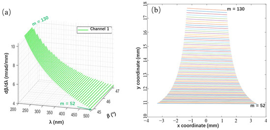 Theoretical Two-Dimensional Spectrum of the designed spectrometer. (a) Wavelength–diffraction angle–angular dispersion relationship of the echelle gratings. (b) Spectral model coordinates.