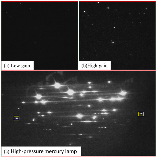 (a) Raw image of a low-pressure mercury lamp with low gain. (b) Raw image of a low-pressure mercury lamp with high gain. (c) Raw image of a high-pressure mercury lamp.