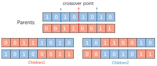 The schematic diagram of the crossover process in Figure 8 illustrates how a pair of parent chromosomes exchange genetic information to produce two offspring chromosomes. Each binary string represents a chromosome, and each digit represents a gene. The crossover points are shown in red and blue; the offspring’s chromosomes are given at the bottom.