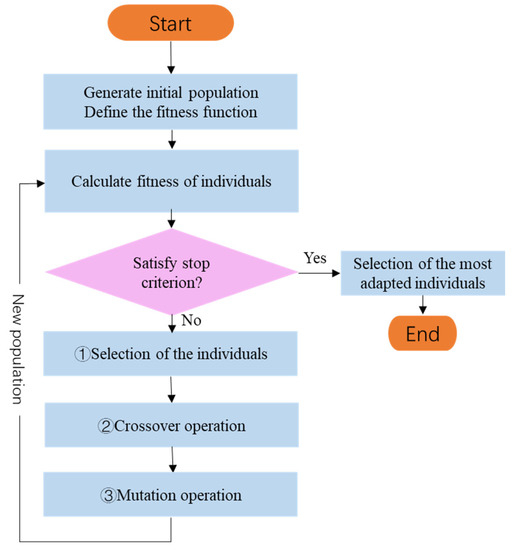 Offspring chromosomes generated by these genetic operators were evaluated and replaced with low-fitness chromosomes in the population. The process is repeated until satisfactory solutions are obtained, or the stopping criteria are satisfied. The flowchart of the GA in Figure 10 summarizes the entire GA process, including the selection, crossover, and mutation operations, and replacing low- with high-fitness chromosomes.