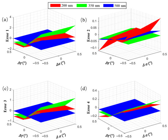 Relationship between the grating incidence angle deviation, deflection angle deviation, and different calibration error evaluation indicators. (a) Error 1: , (b) Error 2: , (c) Error 3:, (d) Error 4: , and respectively signify the disparities between the factual x and y coordinates of the wavelength on the detector and their theoretical counterparts.