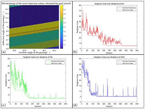 Optimization results of 4 different algorithms. (a) Heatmap of the error function values obtained by grid search, (b) graph of the number of iterations versus the evaluation function in the SA algorithm, (c) graph of the number of iterations versus the evaluation function in the GA algorithm, and (d) graph of the number of iterations versus the evaluation function in the GSA algorithm.