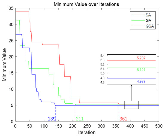 To compare the performances of the SA, GA, and GSA, we plotted changes in the best error function values with the number of iterations and placed them in the same coordinate system, as shown in Figure 14. Additionally, we recorded detailed information regarding the running time, convergence time, best error function values, and corresponding optimal solutions for each of the three algorithms, as presented in Table 1. Based on these data, the following conclusions were drawn: