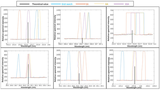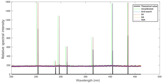 To verify the aforementioned analysis, we conducted precise parameter inversion and calibration using different calibration methods on the measured image of the mercury lamp in Channel 1; the results are shown in Figure 15. The spectral curve obtained without parameter inversion and calibration of the spectral model differs significantly from the theoretical values of the characteristic wavelengths of the mercury lamp. The spectral intensity curves calibrated using different inversion algorithms are presented in Figure 16, and the specific error values are given in Table 2.
