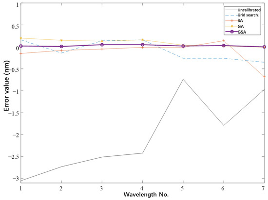 The average absolute error between the theoretical spectral model and actual instrument wavelength without calibration is 2.03 nm, which cannot meet the requirements of instrument usage. Using the traditional grid search method, SA algorithm, and GA can improve the mean absolute error level to 0.1814 nm, 0.16 nm, and 0.1014 nm, respectively, but these methods fail to satisfy the instrument resolution requirement of 0.1 nm [23]. However, the proposed algorithm can improve the error to 0.0257 nm while meeting the resolution requirements.