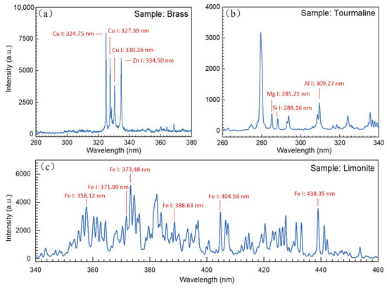 The experimental principle of LIBS in Figure 18 was employed to conduct experiments on various types of rock and metal samples (brass, tourmaline, and hematite). The plasma was excited by a pulsed laser beam with a pulse energy of 33 mJ, and the spectral information was obtained using a high-time-resolution intermediate-dispersion grating spectrometer. The integration time for a single exposure to the instrument was set to 10 ns. By comparison with the NIST database, the emission spectral lines of the main elements in the different samples were determined. After analysis, the characteristic spectral lines of five metal elements, Cu I:324.75, Cu I:327.39, Cu I:330.26, Zn I:334.50, Mg I:285.21, Si I:288.16, Al I:309.27, Fe I:358.12, Fe I:371.99, Fe I:373.48, Fe I:388.63, Fe I:404.58, and Fe I:438.85 nm, were identified and labeled in the corresponding spectral curves in Figure 19.