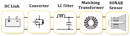 Sound navigation and ranging (sonar) systems detect underwater objects by utilizing electrical energy-to-sound energy conversion. Sonar power systems consist of the following components, as shown in Figure 1 [1,2,3]: (1) a direct current (DC) power supply, which serves as the electrical energy source required for generating acoustic energy; (2) a power converter, which converts the DC voltage into alternating current (AC) to provide the desired electrical energy supply for the required sound signal intensity; (3) an LC filter (or low-pass filter), which removes unnecessary frequencies for acoustic detection; (4) an impedance-matching transformer, which eliminates the reactive power generated by the material characteristics of the sonar sensor; and (5) a sonar sensor, which converts the input electrical signal into an acoustic signal.