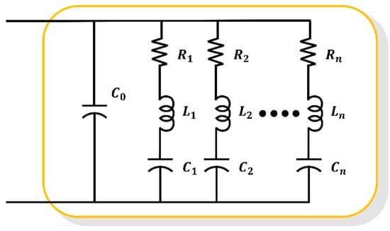 The BVD equivalent circuit, shown in Figure 2, is composed of an RLC branch consisting of resistance (), inductance (), and capacitance () to mimic the electrical resonance frequency characteristics, along with a parallel capacitor () representing the electrical capacitance properties of the piezoelectric component. Therefore, in this study, to reduce sensor errors caused by physical and material factors, an enhanced equivalent circuit with increased electrical resonance modes and RLC branches was employed within the BVD model.
