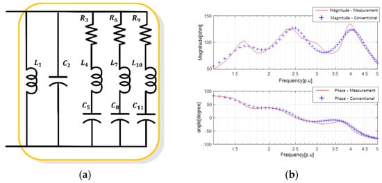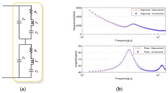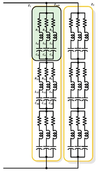 Furthermore, based on the measured characteristics of the sonar sensor, an equivalent circuit was determined. When using a large number of components, parameter estimation required a relatively long time, resulting in more accurate results. Conversely, for a small number of components, the estimation time was reduced, although the accuracy decreased, thus exhibiting a trade-off relationship. Additionally, after deriving the corresponding parameters, a trial-and-error process was performed under human intervention for additional calibration. Therefore, in this paper, we propose a high-degree model composed of 54 RLC components, as depicted in Figure 3, which allows for the selection of different equivalent circuits for each resonance frequency. Thus, the proposed model seeks to overcome the conventional limitations of the sensor characteristic simulation due to the constraints on the number of RLC components.