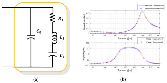 Results of deriving the equivalent circuit of a single resonant sensor using the conventional method: (a) conventional equivalent circuit; and (b) electrical impedance characteristics.