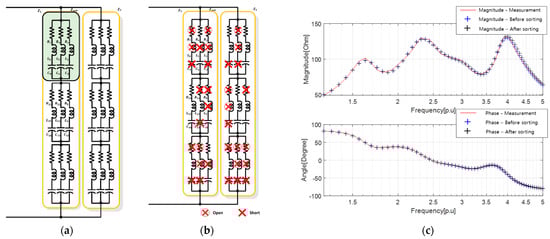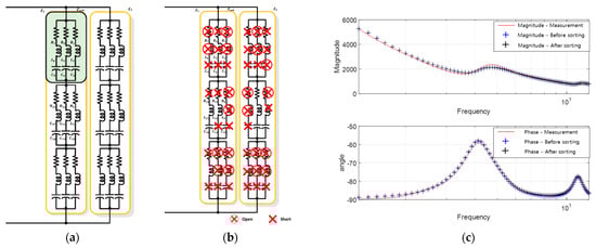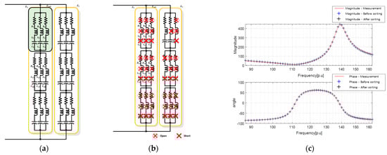 To compare the proposed equivalent circuit and derivation approach for a single-resonant sonar sensor, the results of deriving the equivalent circuit using the PSO algorithm shown in Figure 5 are summarized in Figure 7. Specifically, Figure 7a,b show the configurations of the equivalent circuits with 54 RLC components [EA] each. After excluding components with excessively large or small parameter values, which may appear electrically open or short, the equivalent circuit was sorted, as shown in Figure 7b. The parameter values for each component constituting the equivalent circuit are listed in Table 4 and Table 5. The component arrangement is organized in the order of subscripts from the top-left RLC component of in the table, which corresponds to the 27 top-left RLC components, as shown in Figure 7a. The electrical characteristics of these components are shown in Figure 7c, wherein the blue and black lines represent the characteristic results.