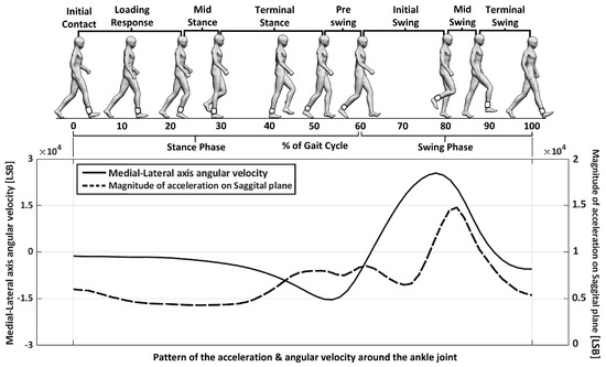This research was based on previous work [53] and involved the development of a device for detecting and classifying gait based on angular velocity around the ankle joint during the swing phase of a gait cycle as shown in Figure 1. The device used modified (out of anatomical axis, i.e., directly measured by the device) the medial-lateral axis angular velocity and the magnitude of acceleration on the Sagittal plane around the ankle joint. In what remains of this article, we will loosely use the terms “angular velocity around the ankle” and “ankle acceleration” to refer to the values measured by the IMU. As shown in Figure 1, the factors changed significantly during the swing phase of the gait cycle, so we focused on this phase for gait detection and classification.