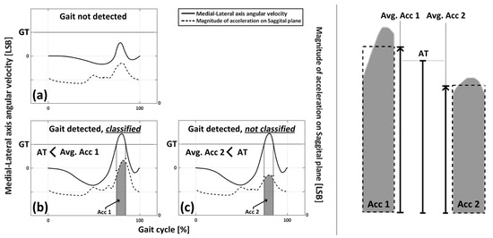 Figure illustrating the role of the AT and GT. (a) The case when a gait was not detected (b) The case when a gait was detected and classified as a good gait (c) The case when a gait was detected but not classified as a good gait.
