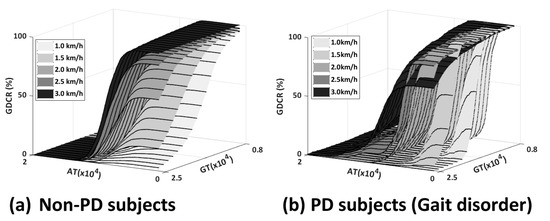Twenty-five subjects participated in the assessments of the previous experiment and we collected the acceleration and angular velocity around the ankle joint during one gait cycle. Then, GDC algorithm was applied to the collected data and we observed relations between AT, GT, walking speed, and gait symptom to GDCR. The GDCR was inversely proportional to the AT, GT, and gait disorders, but directly proportional to the walking speed, as shown in Figure 3.