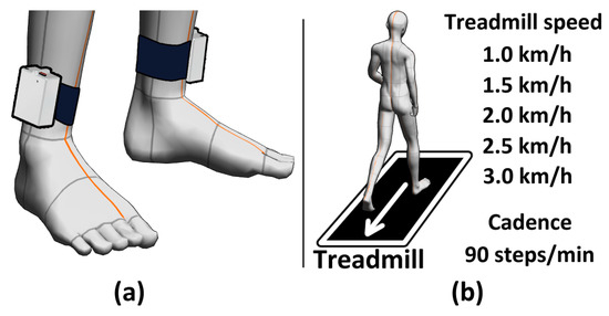 The subjects included 24 females and 1 male, with an average age of 62 years. None of the subjects had diseases that caused gait disorders. Each subject was asked to walk for one minute at 90 steps per minute cadence (45 times with each leg), with the experimenter providing auditory metronome sounds to indicate the exact timing for walking. Subjects walked three times per each case at treadmill speeds of 1.0, 1.5, 2.0, 2.5, and 3.0 km/h. Subjects took a one minute rest and then walked again, following the sequence walk–rest–walk–rest–walk. If there were more data than 90 steps, only the first 90 steps were used. The experimenter controlled the treadmill speed in ascending order (1 km/h–3 km/h).