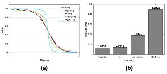 (a) FG from the experimental results when GT was 15,000 and various sigmoid functions; and (b) average error of sigmoid functions from FG.