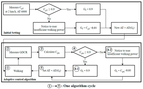To design the GDCR adaptive control algorithm using Equation (9) from Equation (14), we followed these steps: (1) Measure Cp1 at a walking speed of 2 km/h and AT = 6000; (2) Set Gtarget to 0.9 if Cp1 is greater than 0.9, or set Gtarget to 0.01 less than Cp1 if Cp1 is lower than 0.9; (3) Set a new AT at AT(Gtarget) (initial setting end); (4) Exercise with the new AT and collect the new GDCR; (5) Calculate the new Cpn; (6) Set Gtarget to 0.9 if Cpn is greater than 0.9, or set Gtarget to 0.01 less than Cpn if Cpn is lower than 0.9; and (7) Set a new AT with AT(Gtarget). Repeat these steps starting at step 4. Figure 7 shows the design process.