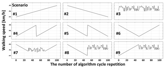 - The seventh scenario presents a V-shaped trend in walking speed with a range of random punctuations in the middle.