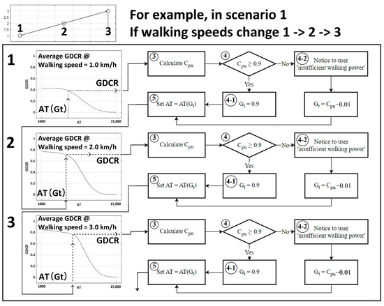 Simulation with each scenario was ran based on the number of algorithm cycle repetition. For example, if walking speeds change from one to three, as shown in Figure 9, the algorithm measure GDCR is based on the AT(Gtarget) at the walking speed = 1.0 km/h. Then, the algorithm return appropriate new AT value ‘AT(Gtarget)’ for the next algorithm repetition. The simulation applied new AT(Gtarget) to the new GDCR curve at a walking speed = 2.0 km/h and returned a new AT value. These processes repeated until simulation ended. Consequently, the average error to GDCR = 0.9 could be calculated.