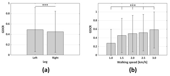 Average GDCR according to legs used and walking speeds. The range of AT was from 1000 to 15,000: (a) The relation between the GDCR and used legs (n = 246; *** p < 0.001); and (b) relation between the GDCR and walking speeds (n = 246; *** p < 0.001).