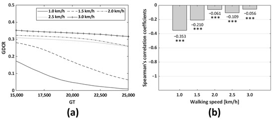 Average GDCR according to the GT and walking speeds. Entire GT range (from 15,000 to 25,000): (a) shape of the GDCR curve according to the GT; and (b) relation between Spearman’s correlation coefficients and walking speeds (n = 441; *** p < 0.001 vs. GT, for each walking speed. In sum, n = 2205).