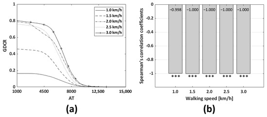 Average GDCR according to the AT and walking speeds: (a) shape of the GDCR curve according to the AT. AT more than 15,000 was trimmed in the figure since there were no significant changes in values; and (b) relation between Spearman’s correlation coefficients and walking speeds. (n = 39,921; *** p < 0.001 vs. AT, for each walking speed. In sum, n = 199,605).