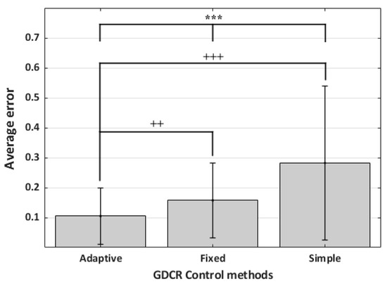 The average error of each control method. (n = 225; *** p < 0.001, +++ p < 0.001, vs. adaptive, ++ p < 0.01, vs. adaptive). Errors from the GDCR control algorithm came from a narrower AT range than other results, e.g., those of Figure 10.