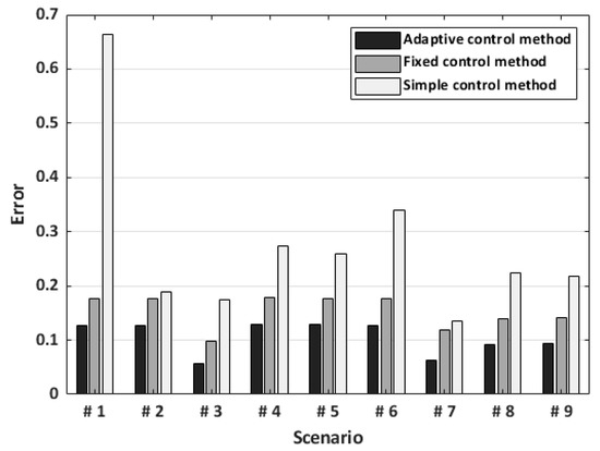 Additionally, the average errors from the experimental dataset were observed for each control method and scenario. The adaptive control method had the best performance in scenario 3, a random scenario, with an average error of 0.06. The highest error was observed in scenario 4, with an average error of 0.14. The fixed control method also had the best results in scenario 3, with the lowest average error of 0.10. The worst performance of the fixed control method was observed in scenario 4, with an average error of 0.18. The simple control method had the lowest average error in scenario 7 (0.13) and the highest average error in scenario 1 (0.66). Figure 14 shows the average errors for all the control methods.