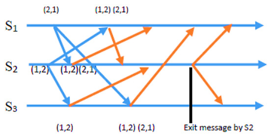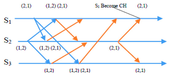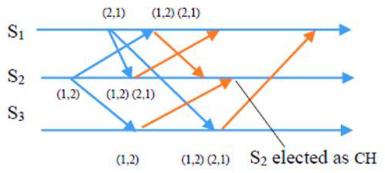 In a scenario with n = 3 sensor nodes, S1 and S2 send REQUEST messages to the other two nodes. The distributed algorithm utilizes each node’s available energy to assign timestamps. S1’s REQUEST message has a timestamp of (2, 1), while S2’s REQUEST message has a timestamp of (1, 2). After broadcasting the REQUEST message, sensor nodes remain idle and wait for REPLY messages from n-1 other sensor nodes (in this example, n = 3). As depicted in Figure 3, S2 received REPLY messages from S1 and S3. Since S2 met the necessary requirements and was at the top of its request queue, it became the CH for this round. The other sensor nodes continued to wait until S2 hit the energy threshold and transmitted a RELEASE message to relinquish its role.