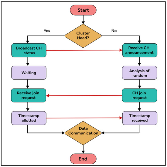 During the cluster formation phase, the CH selects nodes within its radius to form a cluster. The cluster formation and CH election tasks are both performed using the CBERERP algorithm, eliminating the need for a separate algorithm. The algorithm first uses the request condition exit (RCE) distributed technique to elect the CH. Once elected, the CH has all the information about the nodes within its range, including their locations, available energy, and identification numbers. Each node maintains a request queue, which stores information about all other nodes, excluding those not participating in the CH election process, already elected as a CH, or low on energy. The CH forms a cluster with these known nodes, while the nodes not included in the CH election process or with low energy join the nearest CH within their range. When a node comes in the range of multiple CHs, it uses a selection process called the random method to choose the low-energy CH closest to it. If that CH is not available, the node selects the CH with the longest range and highest energy to distribute the load and improve the network’s lifetime. The process of cluster formation and CH selection is explained in detail in Figure 6. Once elected as a CH, node i can initiate the CBERERP algorithm by broadcasting an announcement message to establish a cluster. Other sensor nodes can then join the cluster, while those not participating receive the announcement and use the priority-based random algorithm to select their CHs. The non-CH node k sends a joining REQUEST message to the identified CH with its time-stamp value. The CH accepts the request, synchronizes the sensor node based on the time-stamp value, and forms the cluster. Once formed, the inter-cluster and intra-cluster routing algorithm is activated to identify the path for data exchange between the sender and receiver nodes. In this algorithm, CH plays a critical role in routing. Additionally, the proposed CBERERP algorithm includes a balanced routing mechanism based on next hop information.