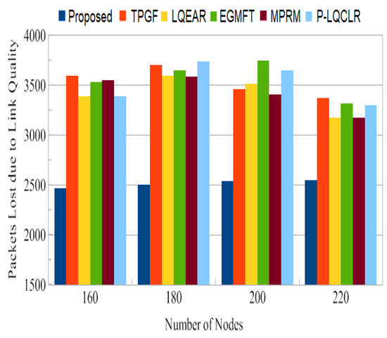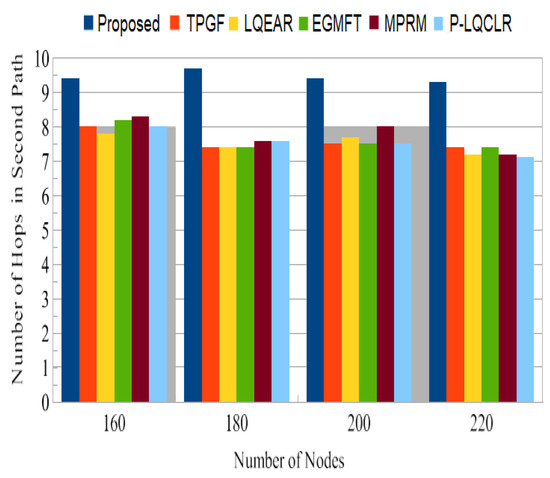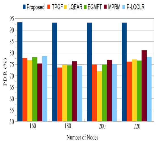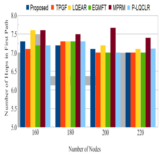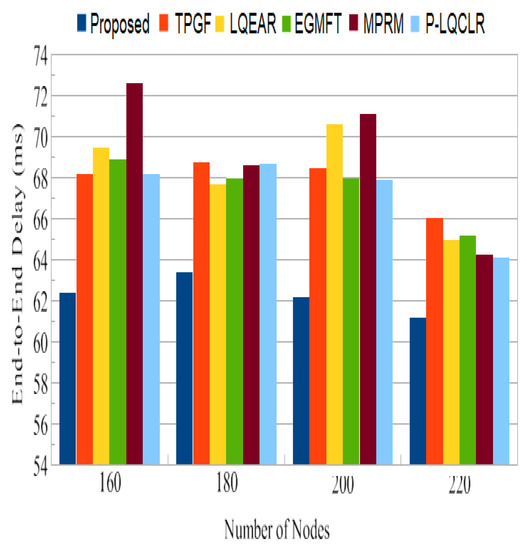 In this section, the proposed protocol’s multi-path performance is compared to that of other protocols in the absence of information service differentiation, as well as without frame retransmissions. PROPOSED is compared to TPGF, LQEAR, EGMFT, MPRM, and P-LQCLR utilizing routing protocols in the NS-2.35 network simulator.