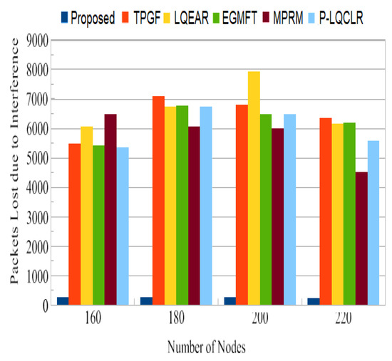 PDR is a crucial metric for assessing the reliability of a routing system. The PROPOSED protocol achieved an average PDR close to 93%, which is significantly higher than the range of 73% to 81% observed for the other protocols. This indicates that the PROPOSED protocol is more effective in successfully delivering packets to the sink node. The higher PDR of PROPOSED can be attributed to its ability to identify paths with minimal adjacent path interference, reducing the chances of packet collisions and losses. Figure 11 shows that TPGF and other protocols experienced a disproportionately high number of data packet losses due to interference from neighboring nodes. This is attributed to the strong inter-path interference impact and the presence of heterogeneous high-power nodes (HNP) at the sink node. In contrast, the PROPOSED protocol demonstrates fewer packet losses in this scenario by selecting paths with less adjacent path interference. The results in Figure 12 indicate that the other protocols experienced 27% to 31% more packet losses due to poor link quality compared to the PROPOSED protocol. PROPOSED selected a higher percentage of good-quality links, as was estimated through the measure of triangle links’ quality, resulting in less packet loss. This highlights the effectiveness of PROPOSED in terms of mitigating the impact of poor link quality on packet delivery. The PROPOSED protocol demonstrated shorter end-to-end delay compared to other protocols, as shown in Figure 13. This indicates that PROPOSED can deliver data packets more quickly, making it suitable for delay-sensitive multimedia transmissions. The reduced delay can be attributed to the PROPOSED protocol’s ability to create paths with minimal inter-path interference effects.