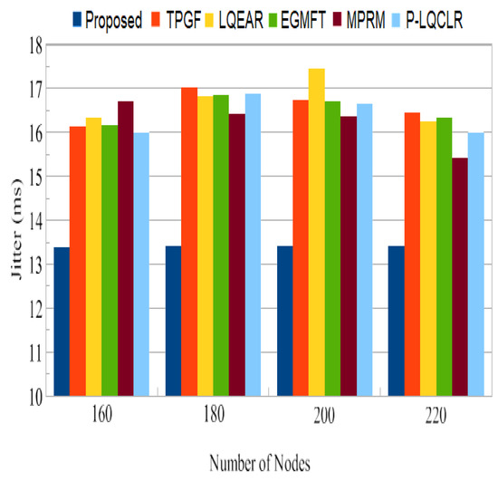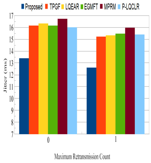 Jitter: Figure 23 shows that the PROPOSED protocol had lower jitter for data packets with 0 and 1 retransmissions than TPGF and other protocols.