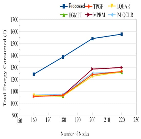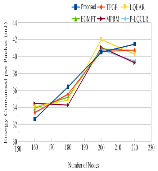 Jitter, as shown in Figure 14, represents the fluctuation in the end-to-end delay of packets received at the sink. PROPOSED exhibited lower jitter compared to other protocols, indicating more consistent and predictable packet delivery. This is advantageous for maintaining high-quality audio and video transmissions. Figure 15 illustrates the average power consumption of the networks during the simulation. It can be observed that TPGF and other protocols consumed 14% less energy compared to PROPOSED. This can be attributed to PROPOSED delivering additional data packets and transmitting small INFO packets during neighbor discovery, as well as the presence of extra hops on the derived second path. However, Figure 18 shows that the average energy used per packet was similar for all protocols, regardless of the number of nodes. This implies that, on a per-packet basis, the energy efficiency is comparable among the protocols. The lifespan of a network after deployment is an important consideration. Figure 19 shows that the PROPOSED protocol achieved longer network lifespans compared to TPGF and other protocols. This is because the PROPOSED protocol effectively manages routes and avoids using relay nodes that quickly exhaust their energy. In contrast, other protocols may continue to send data traffic through broken links, leading to reduced network lifespans. Thereby, the evaluation and comparison of network performance characteristics highlight the superiority of the PROPOSED protocol in terms of PDR, end-to-end delay, jitter, and network lifespan. It demonstrated better performance in terms of successful packet delivery, reduced delay, lower jitter, and longer network lifespans compared to the other evaluated protocols. However, it should be noted that the PROPOSED protocol consumed more energy compared to other existing methods.