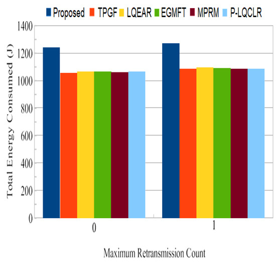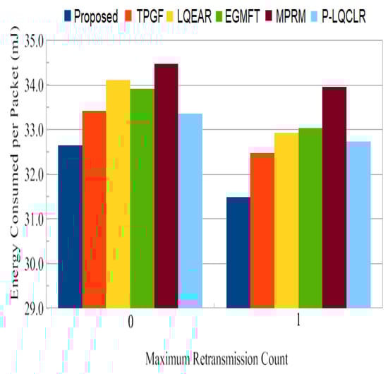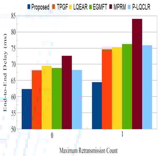 End-to-end delay: In addition to often dropping data frames, networks of poor quality also have greater delays as a result of data frame retransmissions. Figure 22 demonstrates that the PROPOSED protocol transfers packets from the source node to the sink node in a comparably shorter amount of time than the TPGF and other protocols with 0 and 1 frame retransmission counts. In addition, it can be observed that for other protocols, there was a more substantial upsurge in end-to-end delay for frame retransmission compared to PROPOSED. With a frame retransmission count equal to one, it was found that end-to-end delay was 16% higher for TPGF and 30% higher for MPRM when compared with PROPOSED.