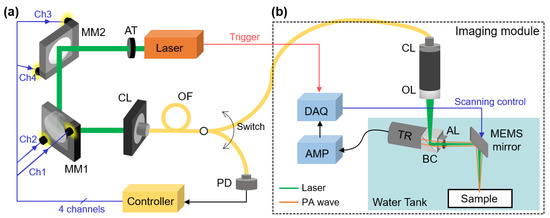 - Moothanchery, M.; Bi, R.; Kim, J.Y.; Balasundaram, G.; Kim, C.; Olivo, M. High-speed simultaneous multiscale photoacoustic microscopy. J. Biomed. Opt. 2019, 24, 086001. [Google Scholar] [CrossRef] [PubMed]