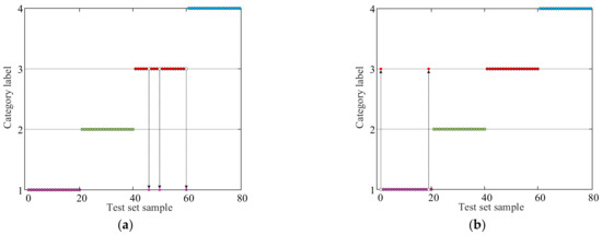 Bearing signals collected in this test mainly included four types: normal bearings, bearings with faulty inner rings, bearings with faulty outer rings, and bearings with faulty rolling elements. Vibration signals within 1 s of each type of fault (totaling 16,000) were collected as test data, eight time-domain features within 0.01 s (totaling 160) were extracted as a set of data, and 100 groups were selected for each bearing type, totaling 400 groups. During fault diagnosis, 80 groups for each type (320 groups) were selected as training data, and 20 groups for each type (80 groups) were selected as test data. The specific parameters are shown in Table 6 [37,38].