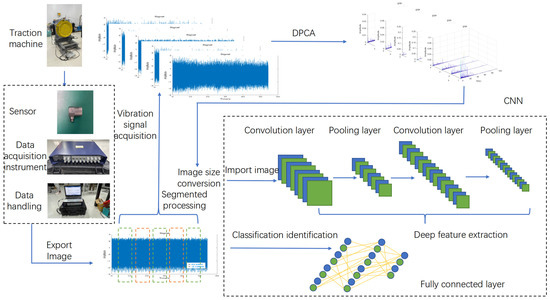 Liu Y. et al. [11] used a new demodulation method based on time–frequency analysis and principal component analysis (DPCA) to extract periodic modulated wave signals, which provided a new method for the rapid and effective condition monitoring of traction machinery. This method can be extended to detect other background disturbances and typical faults. Based on the above reasons, in response to the operating status of the traction machine during idle operation, data were obtained by arranging vibration sensors to monitor the operating status of the traction machine at 6 different speeds. This paper presents a novel approach that combines the demodulation method based on principal component analysis (DPCA) with the visual geometry group network (VGG) model in CNN, aiming to identify the operational state of the traction machine. The innovation of this method lies in its ability to not only achieve state recognition of traction machine vibration signals but also exhibit strong demodulation performance even under low signal-to-noise ratio conditions. By integrating DPCA with the VGG model, the proposed approach enhances feature extraction from vibration signals and improves the accuracy of identifying the running state of the traction machine. In addition, the results were compared with other algorithm models to verify the superiority of the proposed DPCA-VGG16 state recognition model. Finally, a conclusion was drawn.