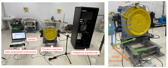 To ensure the diversity of experimental data, three directions were selected to obtain vibration data. As shown in Figure 3, the vibration acceleration sensor was placed on the base of the traction machine and fixed along the vertical diameter, as well as the horizontal, radial, and axial directions using a magnetic base. The sensor parameters are shown in Table 2. The running direction of the traction machine was clockwise and upward, without any load. To ensure the effectiveness and safety of the experiment, data sampling was selected during the stable operation stage of the traction machine, with a steady-state sampling time of no more than 60 s and an input frequency of 5–30 Hz. Extreme ultra-high and ultra-low frequencies were removed to achieve efficient classification. According to formula (7), at the maximum input frequency of 30 Hz, the main vibration frequency was only 112.5 Hz. Therefore, the sampling frequency of the dynamic signal was set to 600 Hz. This included most harmonic frequencies. If a higher resolution was chosen, it would be affected by high-frequency signals, which would affect the resolution of the spectrum and frequency domain.