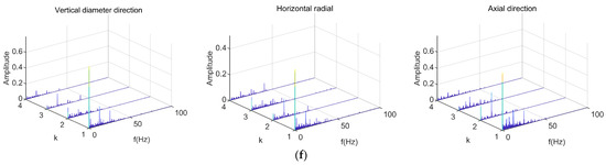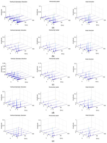 Based on the above collection conditions, vibration signals of elevator traction machine equipment can be obtained under six different operating states. These operating states all operate at a steady speed without load, but their input frequencies are different. The input frequencies are 5 Hz, 10 Hz, 15 Hz, 20 Hz, 25 Hz, and 30 Hz, respectively. The vibration signals were input into the DPCA demodulation algorithm to obtain the demodulation diagram. The three principal components of the vibration signals were selected for feature extraction. The demodulation results obtained are shown in Figure 4, where the directions represented from left to right are: vertical diameter direction, horizontal radial direction, and axial direction.