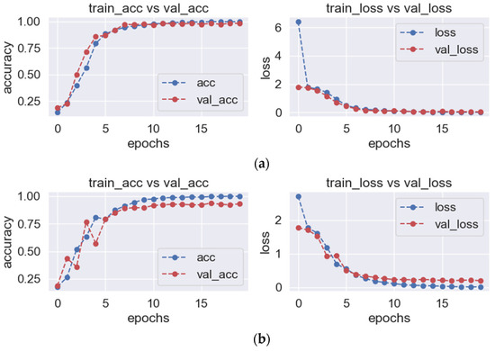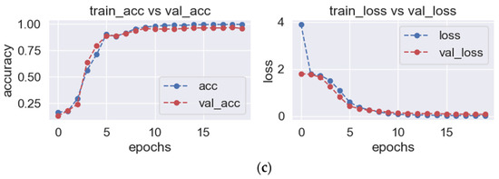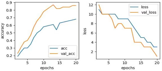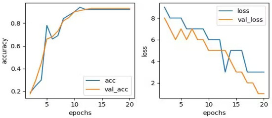 The image input size was 224 × 224. This is because the convolutional layer and pooling layer structures in the VGG16 model were designed for image sizes of 224 × 224. The batch size was set to 128. This can make the calculation amount of each batch moderate, fully utilize the parallel computing power of the GPU, and avoid the problem of insufficient graphics memory. At the same time, larger batch sizes can also lead to a smaller update range, so it was possible to reduce the vibration of the model in the training process, thus improving the rate of convergence and stability of the model. The epoch was set to 20. It can enable the model to obtain sufficient learning and optimization during the training process, without causing overfitting or excessive training time issues. The validation split was set to 0.2. A portion of the data in the training set can be used as a validation set for evaluation in order to better evaluate the model’s generalization ability. Using this method can avoid the impact of model differences caused by random initialization and other reasons, and can also avoid overfitting problems when evaluating the use of test sets. The initial learning rate was set to 0.1, making the model converge quickly, and then the learning rate was gradually reduced to improve the model performance. Weight decay was set to 0.0001. This controls the strength of the regularization term to help avoid overfitting. The dropout rate set to 0.3. This randomly inactivated some neurons in the network, which helped prevent overfitting.