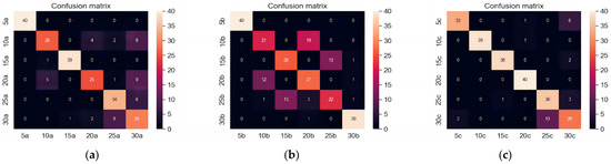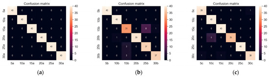 Confusion matrix identified by the time domain diagram. (a) Vertical diameter direction; (b) Horizontal radial; (c) Axial direction.
