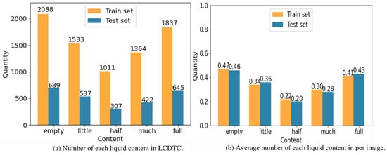 (a) shows the number of each liquid content in transparent container in the train set and test set on the LCDTC and (b) shows the average number of each liquid content per image in the train set and test set on the LCDTC.