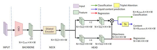 The network architecture of our baseline LCD-YOLOF detector, which is inherited from that of IPH-YOLOF [56]. The liquid content prediction head with triplet attention is the difference to the original IPH-YOLOF.