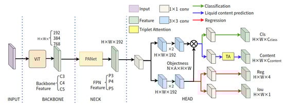 The total loss is made up of the losses related with classification, regression, the confidence of boxes, and liquid content prediction, denoted by , , , and , respectively. is a constant which denotes the weight coefficient of loss for the liquid content prediction head. The definitions of these losses are as follows [56,62]: