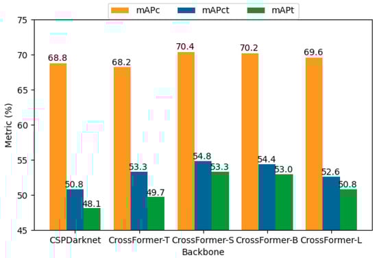 Impact of the backbone network on LCD-YOLOX. In order to study the influence of the backbone network of LCD-YOLOX on detecting liquid content in transparent containers, we evaluate LCD-YOLOX with different sizes of backbone networks on LCDTC. Specifically, the backbone network is the CrossFormer with four different variants (-T, -S, -B, and -L stands for tiny, small, base, and large, respectively). For more detailed configurations of CrossFormer’s four variants, please refer to [27]. For comparison we also show the performance with the origin backbone network (i.e., CSPDarknet). Table 3 show the mAPs and the APs at fixed IoUs (i.e., 0.5 and 0.75) with respect to different backbone networks, respectively. As can be seen, with backbone CrossFormer-S, LCD-YOLOX performs best overall except that its s are slightly lower than CrossFormer-L, with the highest , , and of 0.704, 0.533, and 0.548, respectively. In our paper, we use CrossFormer-S as the default backbone network. In Figure 9, we draw the results of the mAP metric by the bar chart, which provides a more intuitive comparison. We can observe that when the size changes from CSPDarknet to CrossFormer-S, all APs and mAPs consistently improved. However, most of the s and mAPs decrease with fluctuations when the size ascends from CrossFormer-S to CrossFormer-L, except the s, which slightly increase during this process. This can be attributed to the fact that expanding the backbone network’s size requires a greater volume of training data to optimize parameters. Considering the size of our dataset, CrossFormer-S serves as the optimal choice for fine-tuning the proposed task.