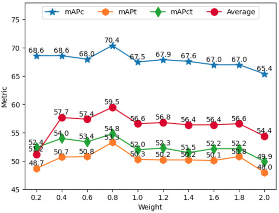 Weighting the loss of predicting liquid content. In order to study the influence of the weighting coefficient for the loss of predicting liquid content, we evaluate LCD-YOLOX on LCDTC with regard to the weighting coefficient, i.e., in Equation (3), which ranges from 0.2 to 2.0 with 0.2 increments. Table 5 display the mAPs and APs of LCD-YOLOX with fixed IoUs (i.e., 0.5 and 0.75) on the LCDTC dataset. Figure 10 show the results of the mAP metric by line chart, facilitating a more intuitive comparative analysis. As presented in Table 5, the best AP values occur within the range from 0.4 to 1.4. However, it is also noted that there are no simultaneous best APs at a fixed in LCD-YOLOX. Consequently, it is important to carefully explore and select the appropriate value to maximize the AP and overall performance of LCD-YOLOX. We can also observe that the variation between the is basically less than 1%, which indicates that there is little impact on the from the changes in , but both and are greatly affected as varies, and the trend of change is basically consistent, denoting that is closely associated with . We can see that the overall maximum values in and occur at = 0.8, which is the default setting in our paper. The experimental results indicate that the maximum values of and are achieved at = 1.4 and = 0.4, respectively, while other APs demonstrate their best performance when is set to 0.8. The results indicate that there may exist a counteracting effect between the localization of transparent container and the estimation of liquid content when these tasks are performed simultaneously as a composite task. Therefore, there is a need to develop more effective approaches that can diminish this counteracting effect, which is a crucial factor that will be taken into account in our future work.