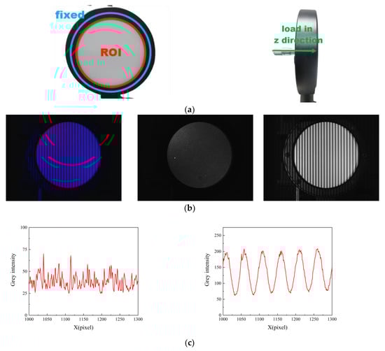 The 3D deformation of the center-loaded disk was evaluated in this study. The disk, as depicted in Figure 13a, was secured in place while the loading device, which applied a load along the z-axis, was installed at its center. Color images, red channel images, and blue channel images are presented in Figure 13b. Figure 13c shows the gray distribution of the red channel image and the blue channel image. It can be seen that the gray distribution of the speckle pattern in the red channel was disorderly, while the gray distribution of the fringe pattern in the blue channel was sinusoidal, which was consistent with the theoretical distribution trend. This can explain why there was almost no crosstalk between the speckle pattern and the fringe pattern. The displacement w was measured, and the results obtained by extracting 100 equally spaced measurement data points in the center row are depicted in Figure 14. A comparison between the measured results and those obtained from the 3D-DIC technique revealed a maximum error of 0.034 mm for the FPP-DIC method. In Figure 14b, it can be seen that the maximum error occurred at positions 30 and 50. The possible reason is that the slope was relatively large at position 30, while position 50 was a peak value. At these special positions, the measurement results for 3D-DIC and FPP-DIC may not match well.