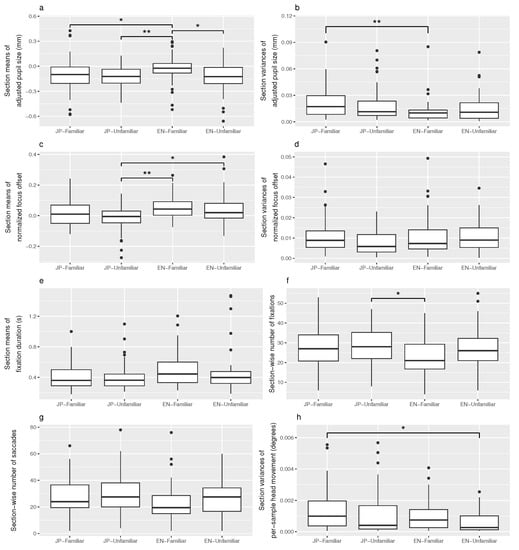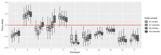 The randomization of the four audio samples was not ideal. A check of the random distribution of the four audio samples unfortunately showed that their order had been biased. If 1 means “always first audio sample” and 4 means “always fourth audio sample,” average positions were 1.73 () for JP-Familiar, 2.73 () for JP-Unfamiliar, 2.64 () for EN-Familiar, and 2.91 () for EN-Unfamiliar. All positions would ideally approach 2.5, but JP-Familiar had the highest chance of coming at the very beginning. At this time, participants had just entered the scene and were most likely to take a first look around the environment. We suspect that our new focus offset metric was affected by this as its calculation is most sensitive to noise induced by saccades.