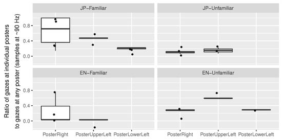 A Shapiro–Wilk test indicated that the distribution of the calculated values deviated significantly from normality (, ). A Kruskal–Wallis test was carried out on participant-wise distraction ratios of looked-at posters, by audio sample. A statistically significant difference was found (, ). Pairwise Wilcoxon rank sum tests with Benjamini–Hochberg p value adjustment were carried out. For JP-Unfamiliar (, ), JP-Familiar (, , , and ), and EN-Unfamiliar (, , and , ) were significantly different and featured higher distraction ratios. This means that for participants who actually got distracted by the posters, the distraction “share” of JP-Unfamiliar as compared to JP-Familiar and EN-Unfamiliar was, on average, 34% and 24% lower, respectively.
